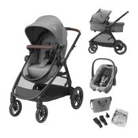Cochecito Zelia S Trio 3 en 1. A medida que tu bebé crece, lo último que necesitas es tener que intercambiar constantemente los artículos imprescindibles. El sistema de viaje del cochecito Zelia S Trio 3 en 1 está a tu disposición para solucionarlo. Este práctico cochecito 3 en 1 viene con un moisés que se transforma en asiento, un elegante huevito Maxi-Cosi CabrioFix S i-Size a juego y un bolso cambiador para guardar todos los elementos esenciales del bebé. Un sistema de viaje para bebés completo y de fácil mantenimiento para uso desde el primer día, que cumple con los altos estándares de seguridad reconocidos de Maxi-Cosi.